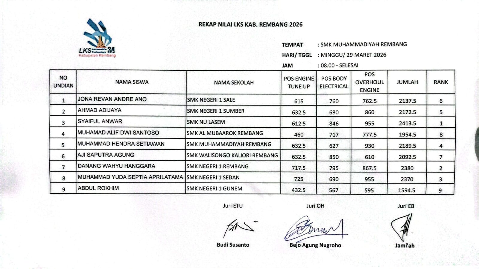 Dengan total nilai 2413.5, Syaiful Anwar mengukuhkan posisinya sebagai peringkat pertama, unggul dari kontingen SMK Negeri 1 Rembang dan SMK Negeri 1 Sedan yang menempati posisi kedua dan ketiga.